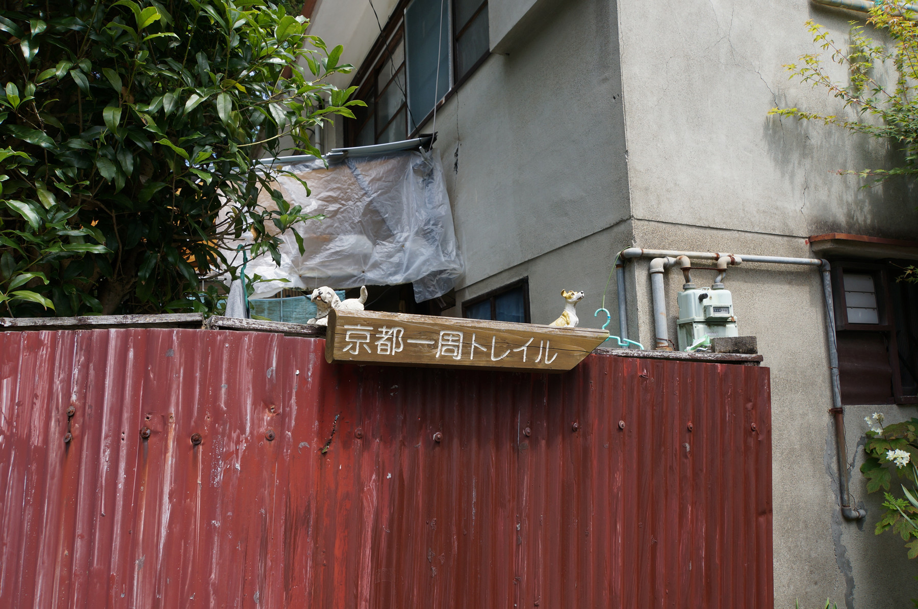 家の塀にトレイル標識と可愛い番犬が飾られていたりする。