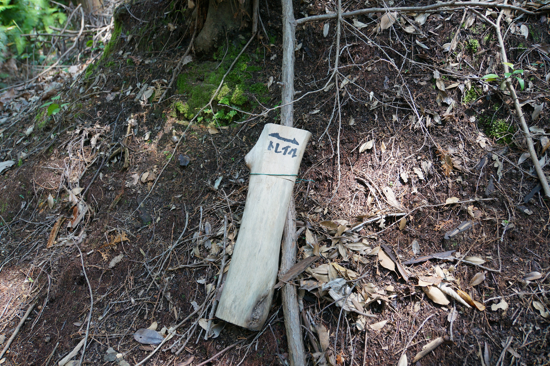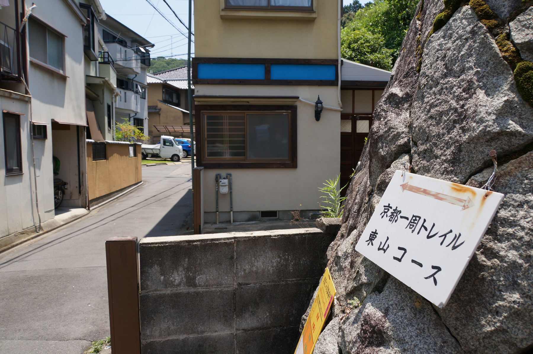 この写真中央付近にある石塔の脇に隠れるようにひっそりと立つ京都一周トレイルの標識がおわかりだろうか。
